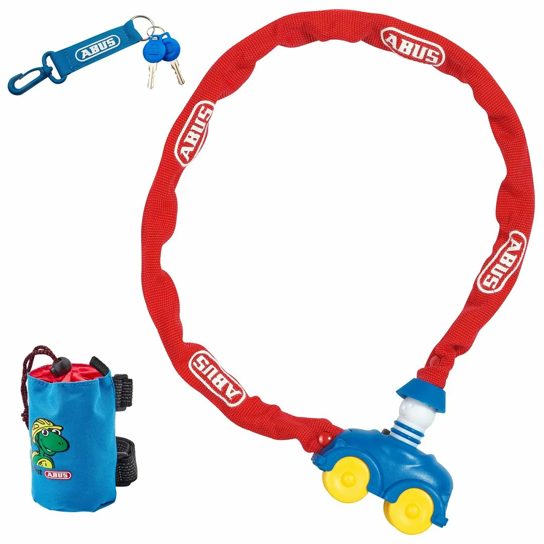 Aufsperren mit Schlüssel, schliessen kinderleicht durch automatische Schließfunktion. Gehärtete Kette mit schützendem Textilschlauch. Bequemer Transport und Schutz durch trendige Schlosstasche