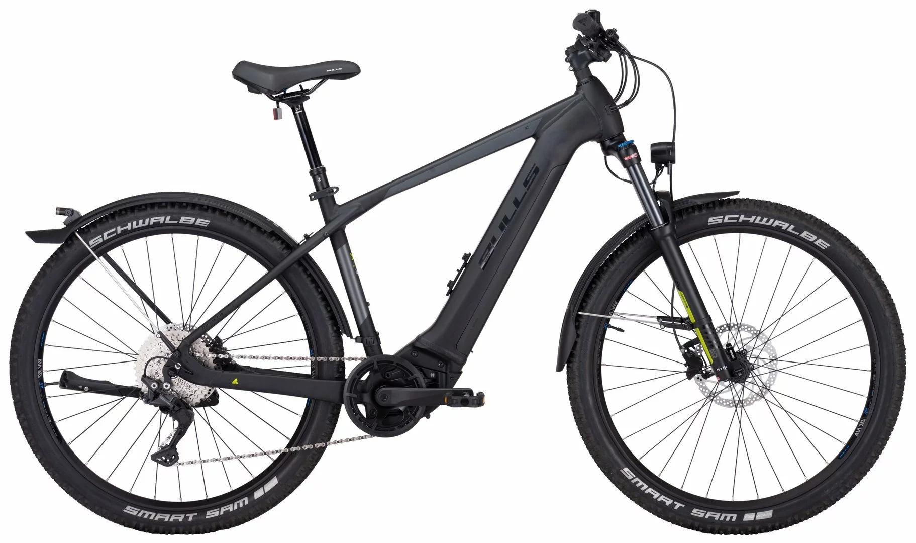 6061 Alu-Rahmen, XCR-Air-HLO Federgabel mit Steckachse, Deore 10-Gang Schaltwerk und Schalthebel, Tektro HD-M390 Scheibenbremsen mit 180mm Bremsscheiben, Ryde Disc-30 Hohlkammerfelgen, Bosch Performance-CX Mittelmotor 85Nm, 750Wh Akku 36V Li-Ion, absenkbare Limotec Sattelstütze, Smart Sam Reifen 27½ x 2,25, Fuxon FS50 LED-Lampe mit 50 Lux, 12 Volt Lichtanlage, SKS Velo 65 Schutzbleche mit integr. Rücklicht, Ständer