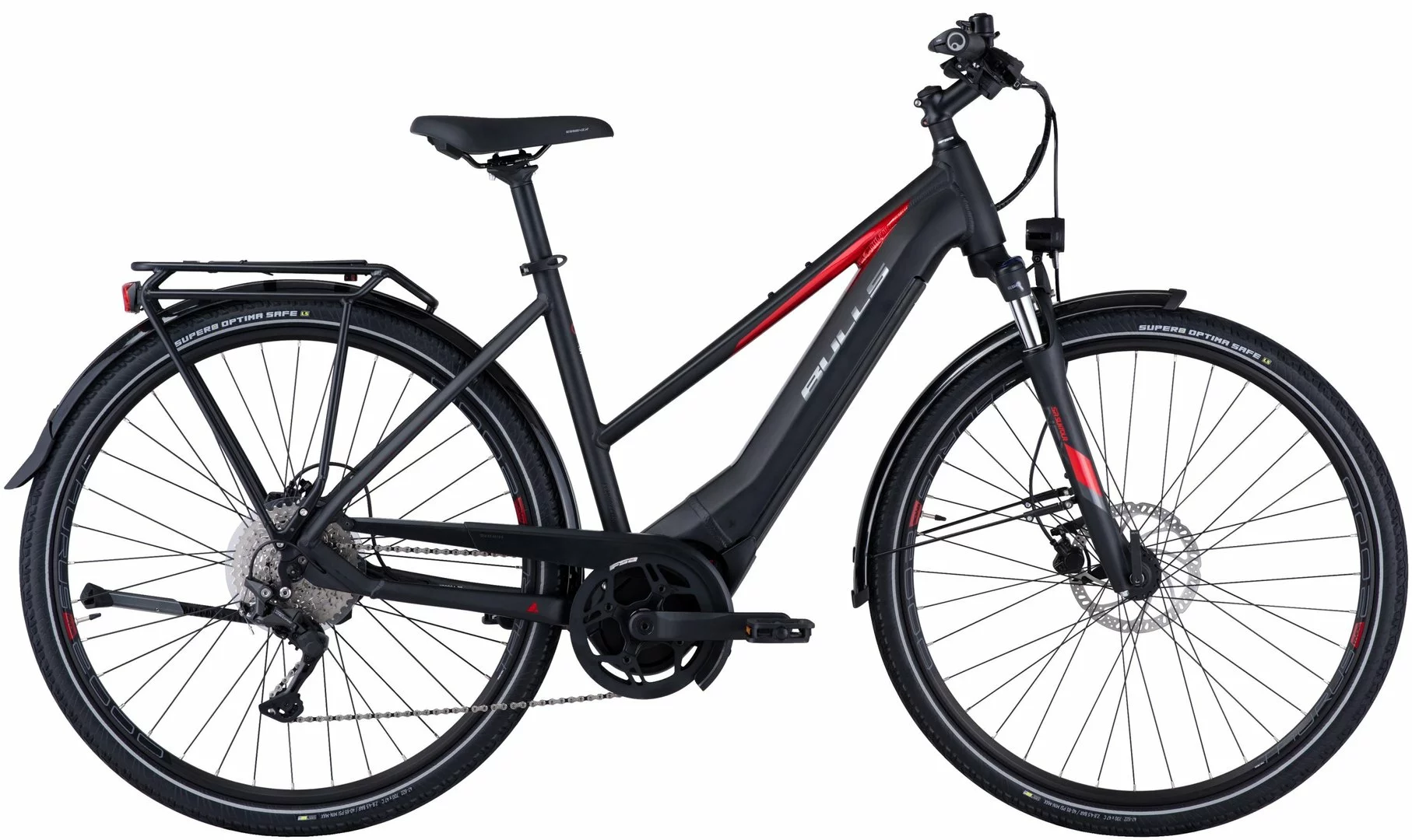 Hydroforming Alu-Rahmen mit Tapered Steurrohr, NEX-E25-LO Federgabel, Deore Schaltwerk, Schalthebel und Zahnkranz (11-42 Zähne), Tektro M275 Disc-Bremsen (160/180mm), Ryde Taurus 2000 Disc Felgen, Brose Drive-T Mag Mittelmotor 250W / bis 70Nm, 555Wh oder 750Wh Akku (Aufpreis), Beleuchtung über den Akku, 50 Lux Lampe, großes TFT-Display, Supero Optima Safe Reifen 47-622, Formula Naben, Ergon Griffe