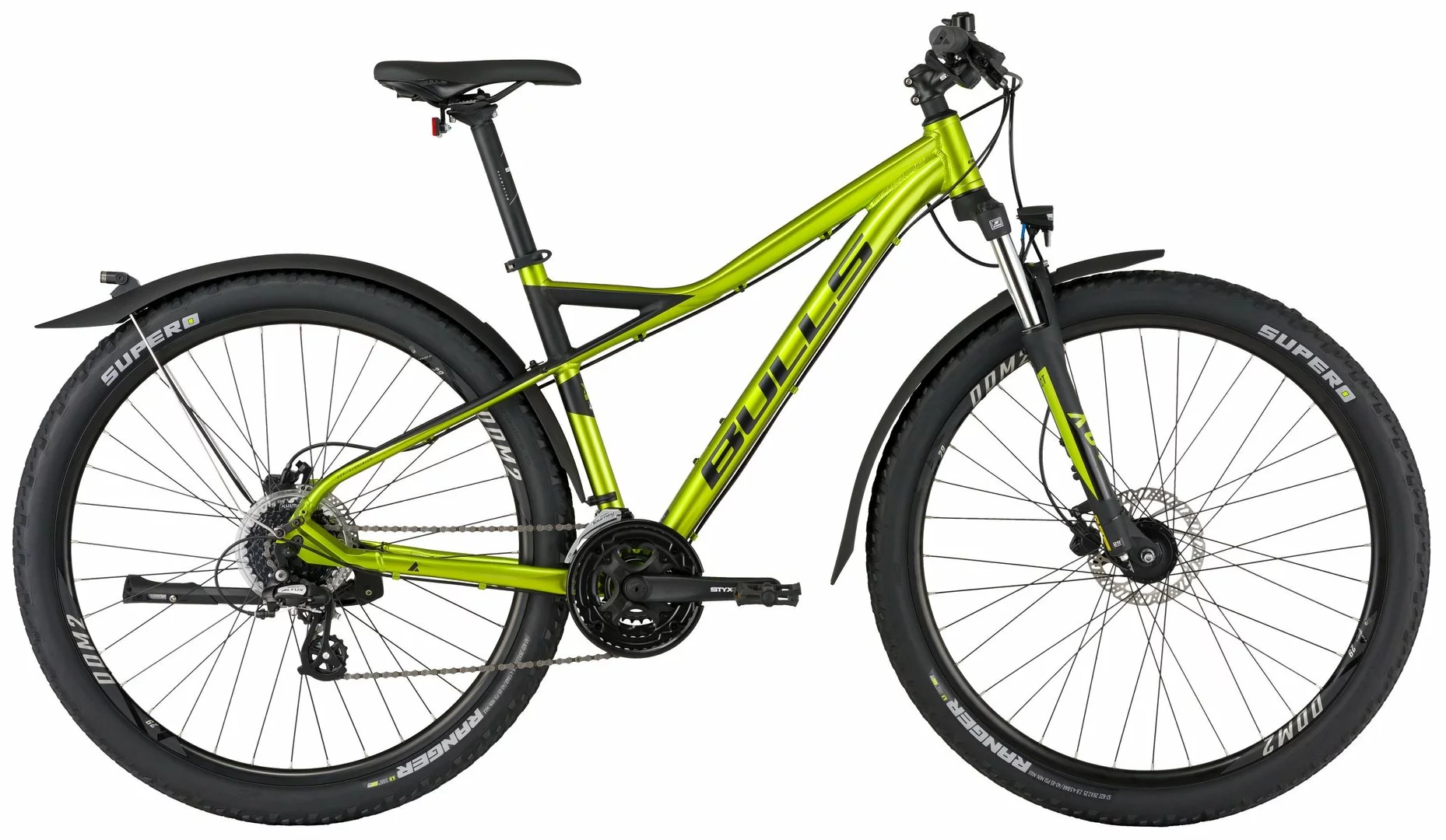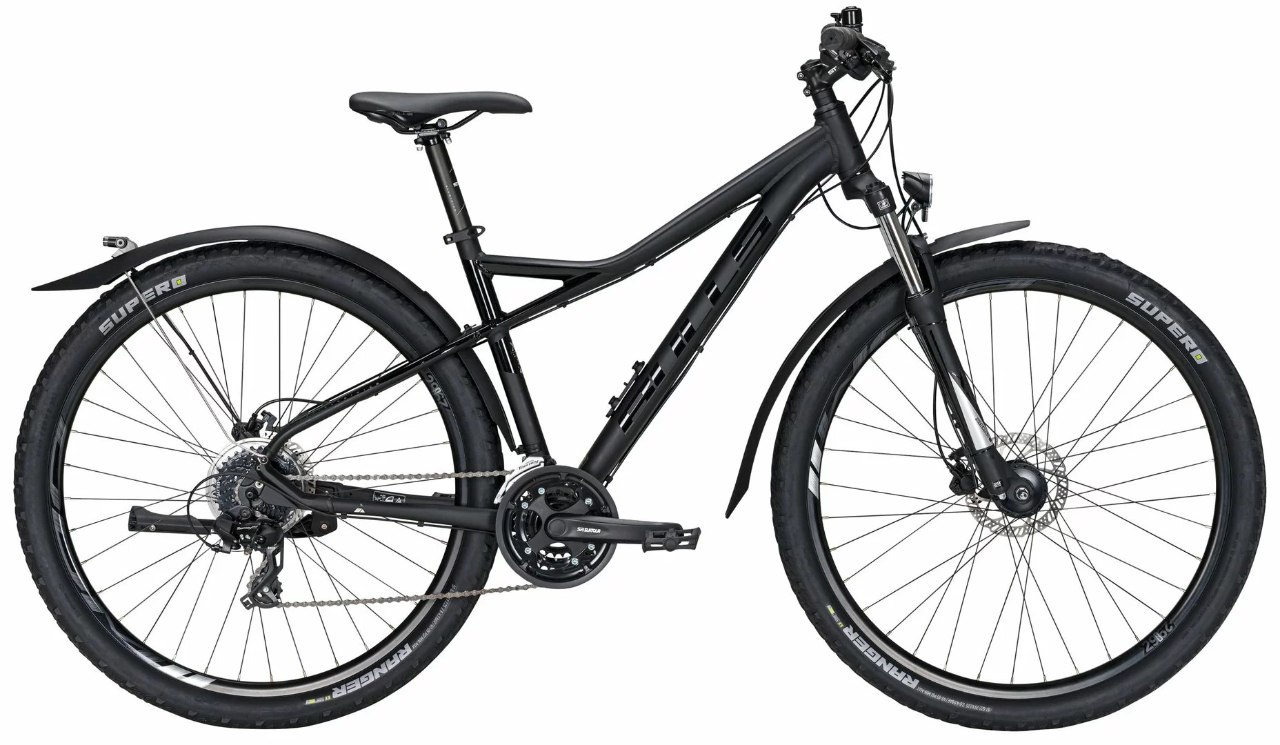 6061 Alu-Rahmen, Suntour XCT Federgabel einstellbar, 24-Gang Altus Schaltung und Schalthebel, Tourney Umwerfer, STYX Kurbeln, Nabendynamo, DDM-2 Hohlkammer-Felgen, Tektro HD-M275 Disc-Bremsen, STYX Sattelstütze, Downhill-Lenker und Vorbau, 30 Lux LED-Lampe, Standrücklicht, Hinterbau-Ständer, Schutzbleche