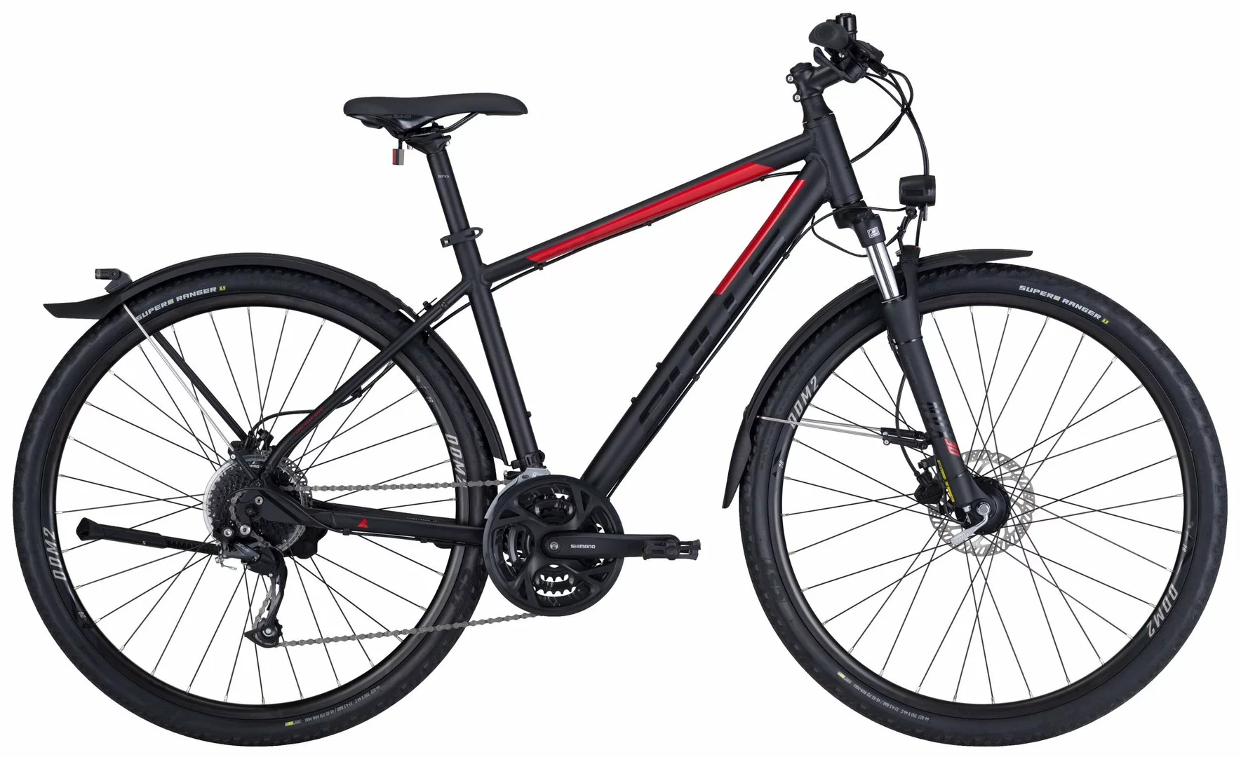 6061-Alu-Biaxial-Rahmen, Suntour NVX Federgabel einstellbar, 27-Gang Shimano Altus Schaltwerk, Schalthebel Umwerfer und Kurbeln, Tektro HD-T275 Disc-Bremsen, Bulls DDM-2 Disc Hohlkammerfelgen, DH-3D32 Nabendynamo, 50 Lux LED-Lampe mit Sensor und Standlicht, Standrücklicht hinten auf dem Schutzblech, SKS Velo 55 Steckbleche mit Streben, Pletscher Flex KSA-40 Ständer