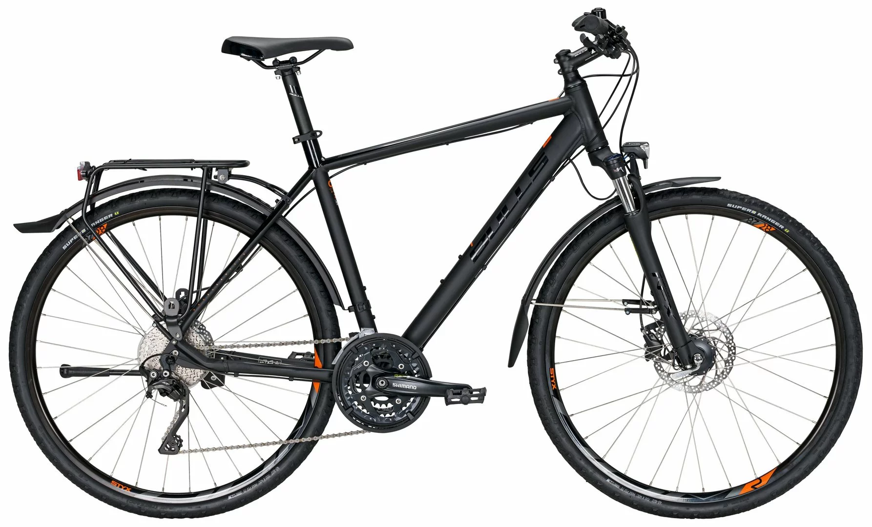 6061-Alu-Biaxial-Rahmen, Suntour NEX-DS-HLO Federgabel, 30-Gang Deore XT Schaltwerk, Deore Umwerfer und Schalthebel, T521 Kurbeln (26-36-48 Zähne), Shimano MT201 Disc-Bremsen (160/180mm), DDM-2 Hohlkammer-Felgen, Nabendynamo, 50 Lux LED-Lampe mit Sensor und Standlicht, Standrücklicht, Gepäckträger, SKS Velo 55 Trekking Steckbleche, Supero Ranger Reifen (44-622), Pletscher Flex KSA-40 Ständer