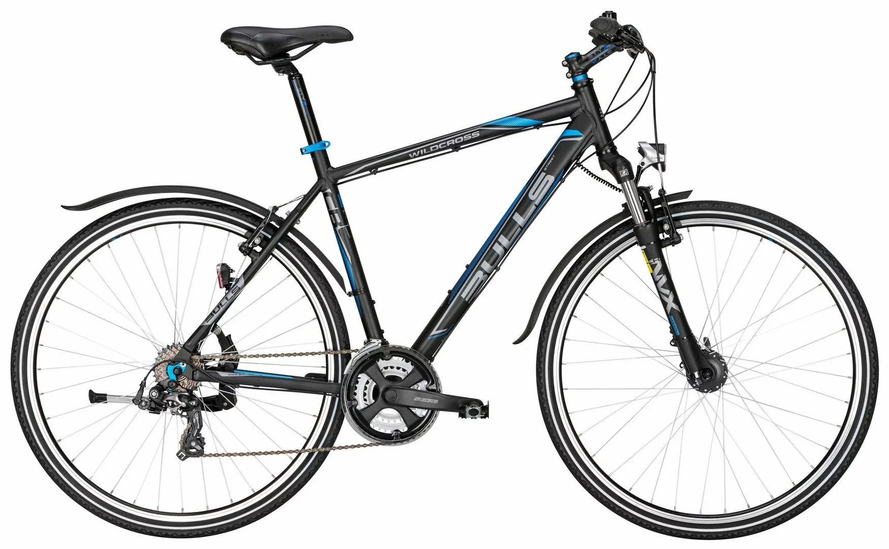 7005-Alu-Biaxial-Rahmen, Suntour NVX Federgabel, 21-Gang Shimano Tourney Schaltwerk und Umwerfer, EZ-Fire Schalthebel, Suntour Kurbeln, Tektro V-Bremsen, Formula HR-Nabe, Alu-Felgen, Nabendynamo, LED-Lampe, Standrücklicht, Ständer, Steckbleche