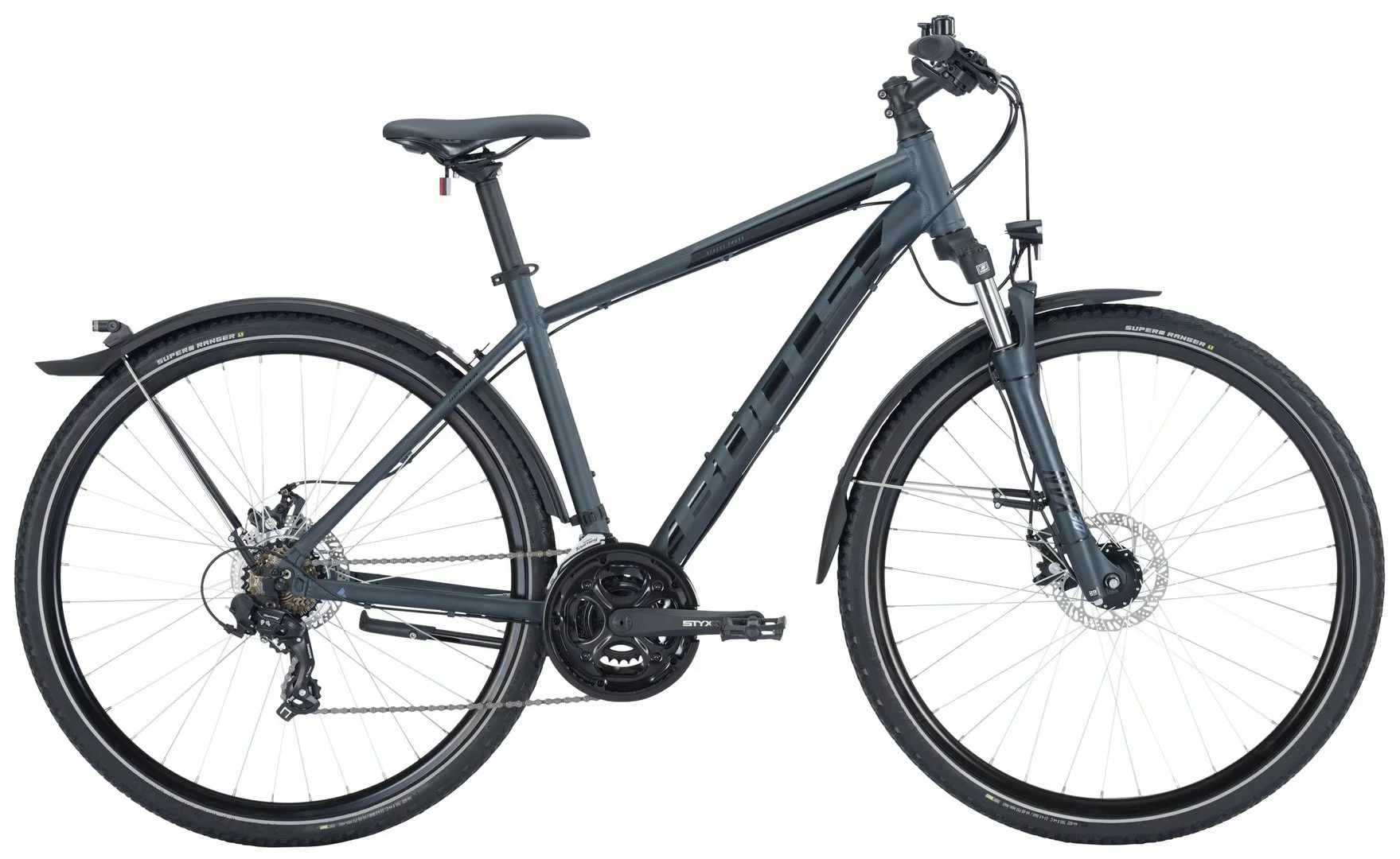 6061-Alu-Biaxial-Rahmen, Suntour NVX-30-DS Federgabel einstellbar, 21-Gang Shimano Tourney Schaltwerk und Umwerfer, Altus EZ-Fire Schalthebel, STYX Kurbeln, Tektro MD-M280 Disc-Bremsen (160/160mm), Formula HR-Nabe, Alu-Hohlkammerfelgen, Nabendynamo, 30 Lu