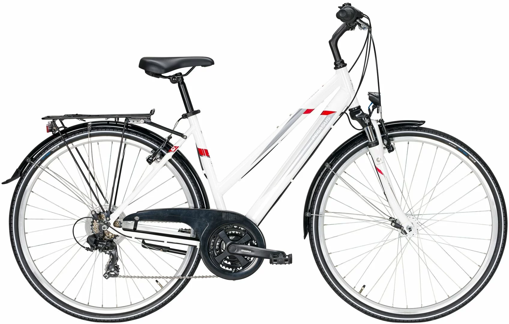 Das Avanti bietet die klassischen Merkmale des Trekkingbikes zum kleinen Preis. Dazu gehört die 18-Gang-Kettenschaltung mit drei Kettenblättern vorne, ebenso eine stoßmindernde Federgabel und helle LED-Beleuchtung mit ausfallsicherem Nabendynamo und Standlicht hinten. Verzögert wird mit kräftigen, einfach zu wartenden Felgenbremsen. Mit dem geschwungenen Lenker sitzt es sich schön aufrecht, was im Alltag und auf Touren sehr angenehm ist. Das mit einem soliden Gepäckträger ausgestattete Trekkingbike ist in drei Rahmenvarianten verfügbar und wird in mehreren attraktiven Farbvarianten angeboten.