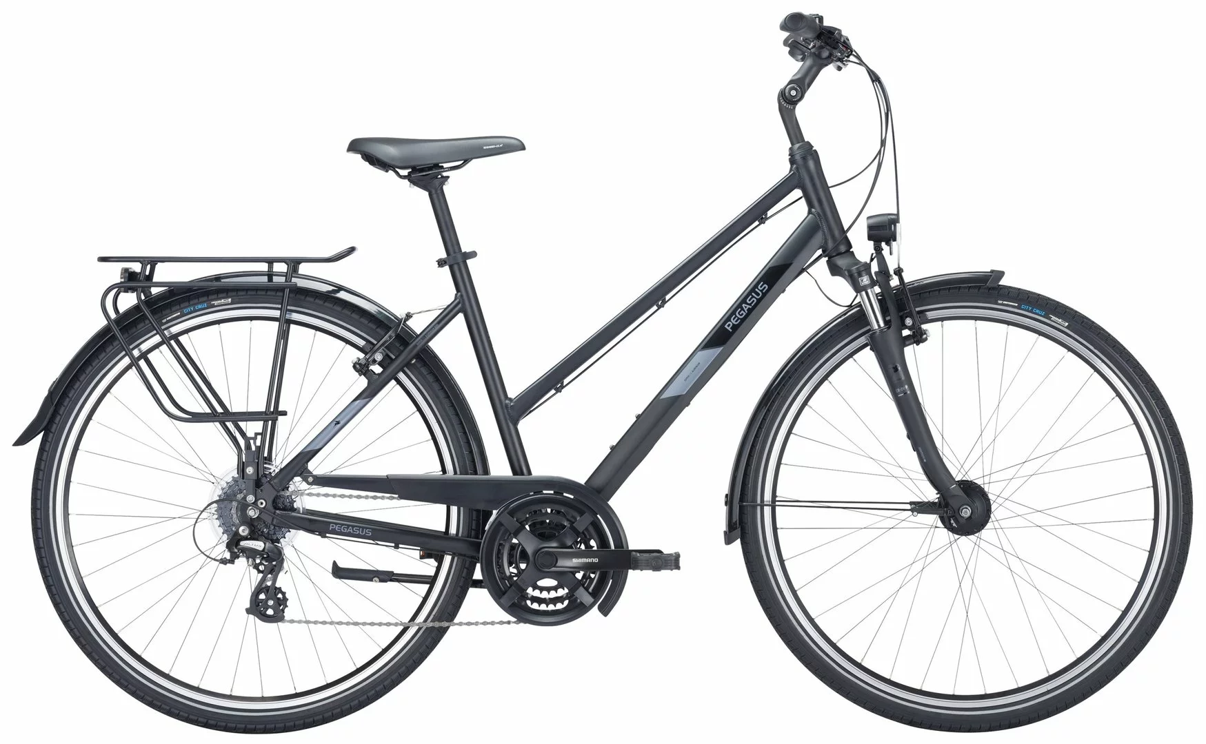6061 Alu-Rahmen, Suntour CR-8V-P Federgabel einstellber, Altus Schaltwerk und Schalthebel, Tourney Umwerfer und Kurbeln (48 Zähne), Formula Kassettennabe, V-Bremsen, DBM-2 Hohlkammer-Felgen, Vee Tire Santa Cruz Reifen (44-622), verstellbarer Vorbau, 2-Bolt Sattelstütze, Nabendynamo, 50 Lux LED Lampe, Standrücklicht, ergonomische Lenkergriffe