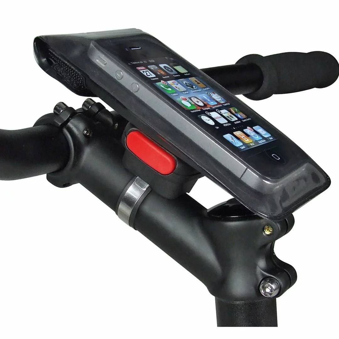 Diese Fahrrad Halterung ist der perfekte Witterungsschutz für Smartphones jetzt in zwei Größen. Ideal zur Navigation – immer im Blick und direkt erreichbar. Das große Klarsichtfenster lässt die Bedienung durch die Folie zu. Schneller Wechsel von Hoch- auf Querformat mit integrierter Drehkupplung. Am Rad wird die Phonebag schnell und sicher mit dem neuen KLICKfix Quad Adapter fixiert. Mit Edelstahlband auf beliebigen Durchmessern von Lenker, Vorbau oder Oberrohr montierbar. Zum Abnehmen genügt die Betätigung einer der beiden großen Auslösetasten.