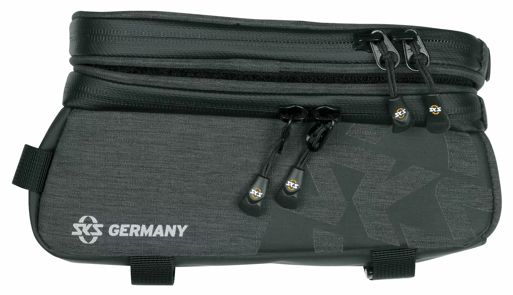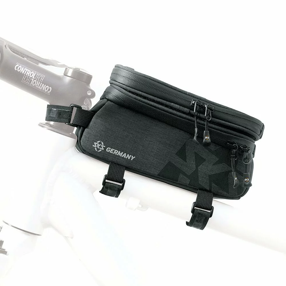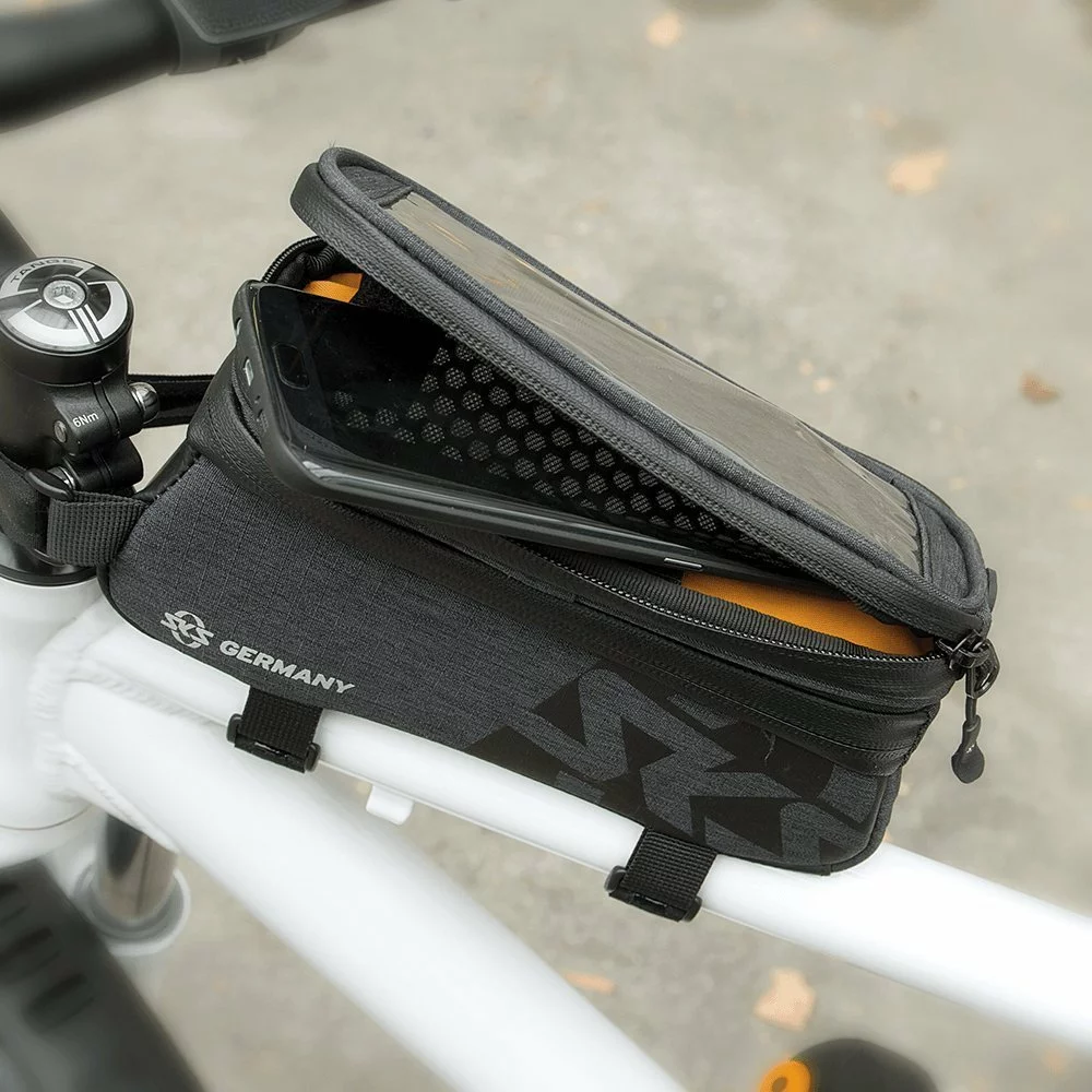 Dank der Klett-Unterseite kann die Handytasche einfach abgenommen werden. Mit robusten, gummierten Klettverschluss-Halterungen wird die Tasche gut erreichbar am Oberrohr befestigt. Zur Ausstattung gehören ebenfalls laminierte, wasserdichte Reißverschlüsse mit ergonomischem EASYZIP, übersichtliche Innentaschen und orangefarbenes Innenfutter zum leichteren Finden der Utensilien.