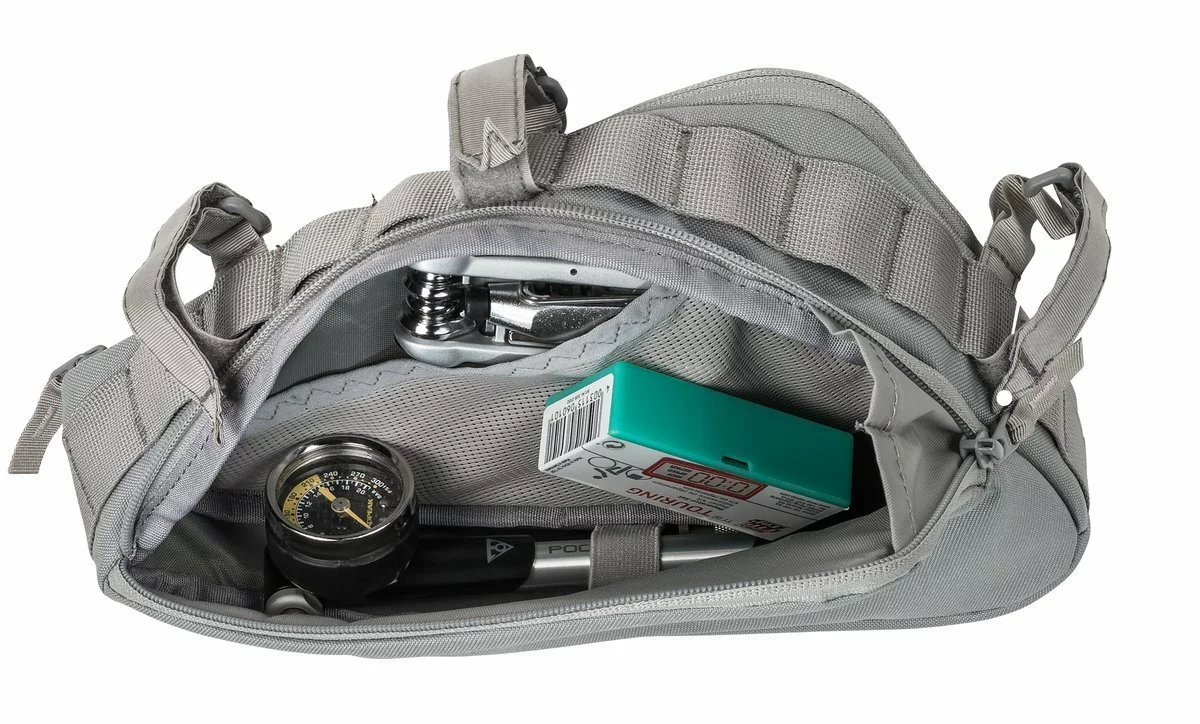 Platzsparend im Dreiecksformat. Die Rahmentasche kannst Du zwischen Ober- und Sitzrohr mit Klettverschluß sicher befestigen. Sie bietet Platz für Werkzeug, Minipumpe und Windweste.